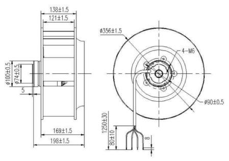 ②组成部件:高效外转子交流电机、后倾式圆弧形铝合金叶轮、免维护深沟球滚珠轴承、静电粉末喷塑转子。
